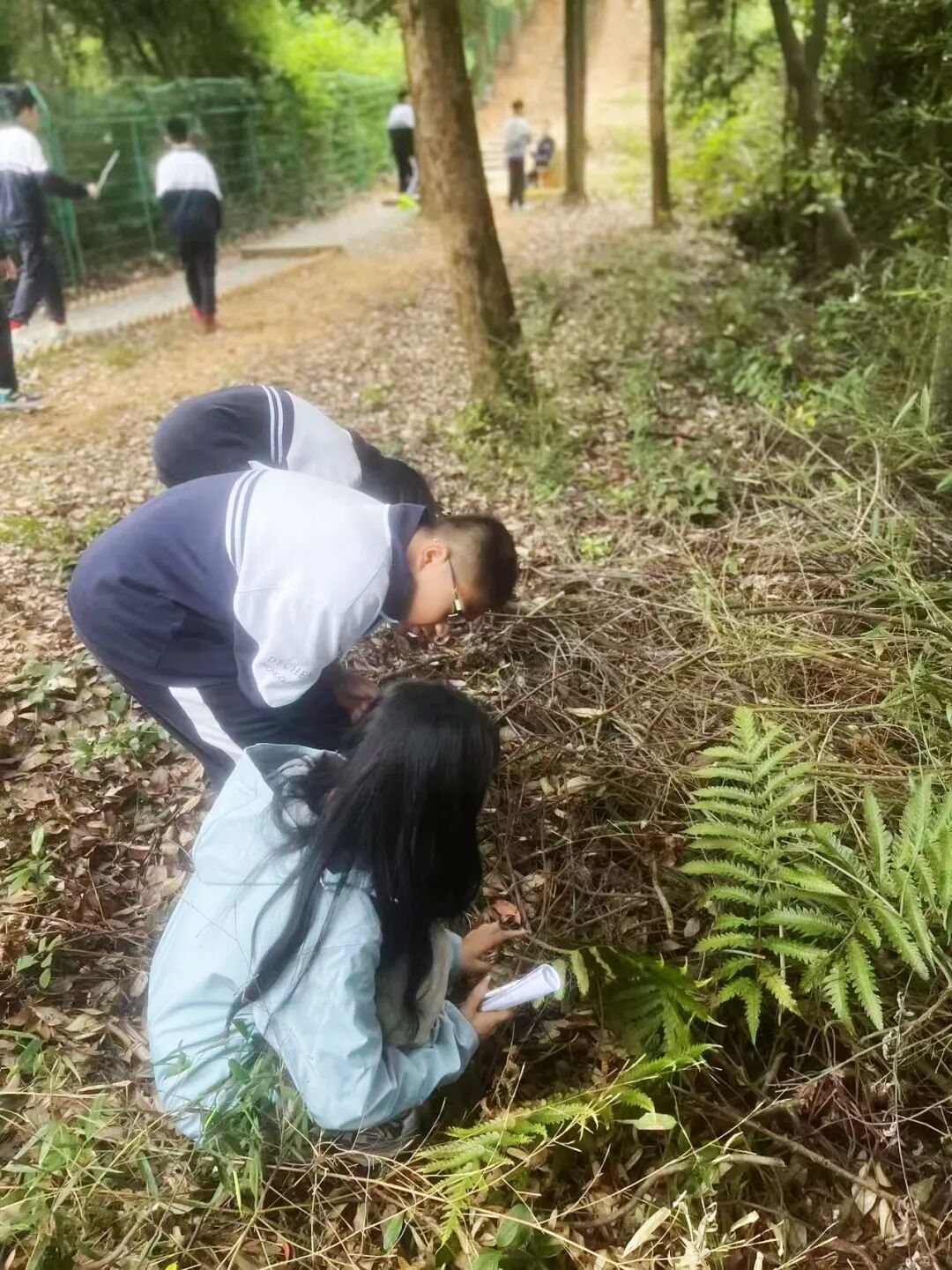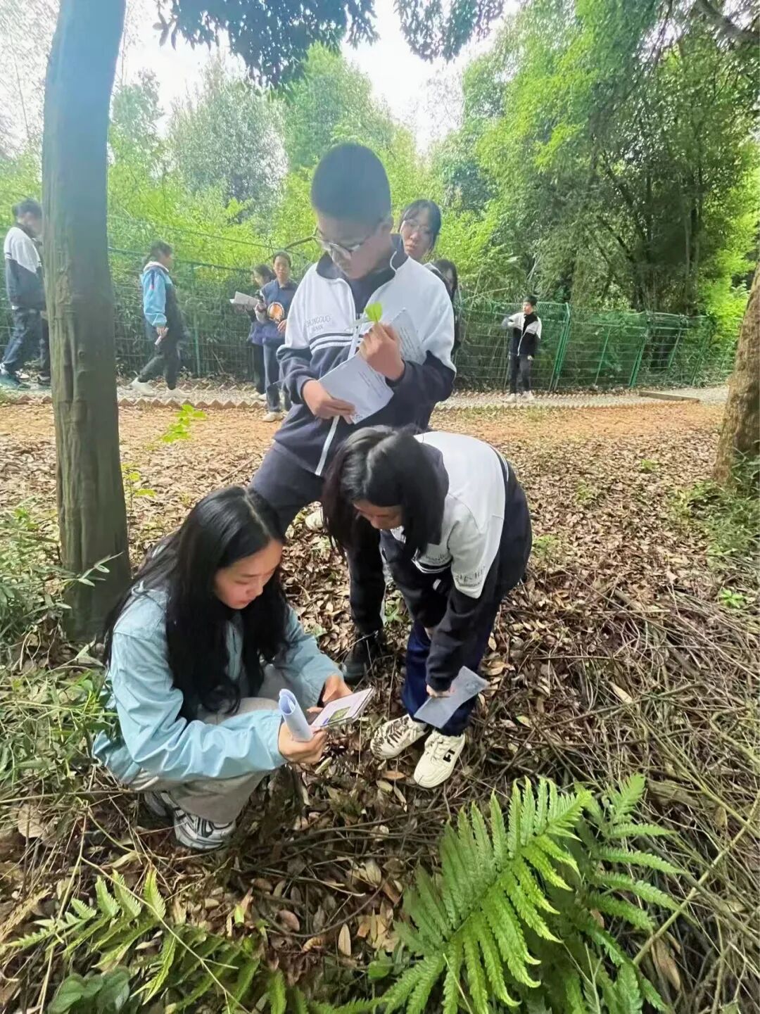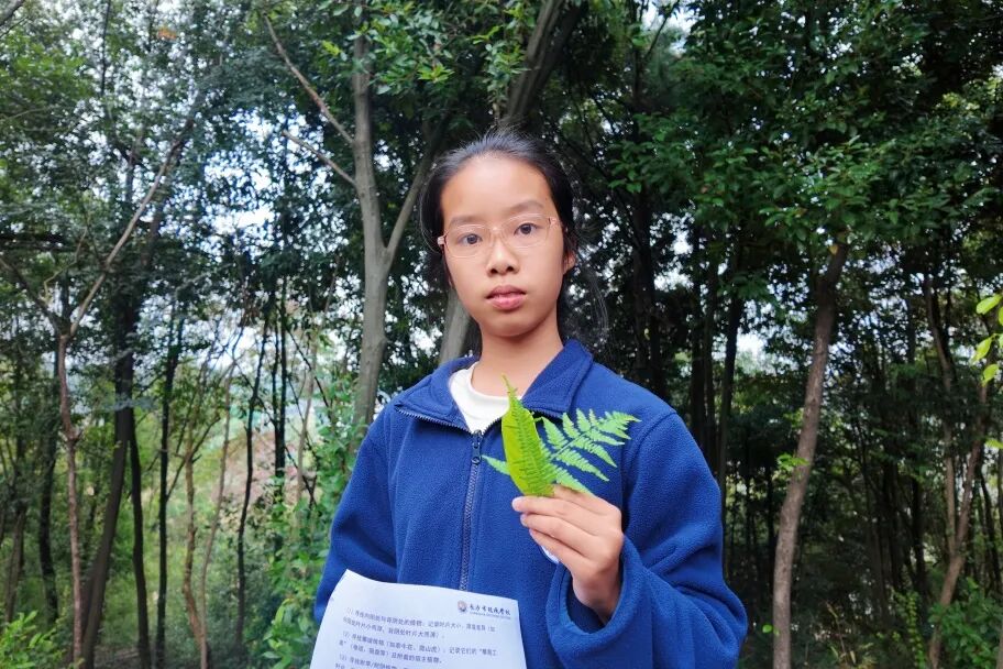 绿意盎然的林间,成了最生动的课堂。同学们或低头在笔记本上认真记录,或小心收集不同形态的落叶;有人专注地比对不同叶片的脉络,也有人轻轻将完整的蕨叶夹进书页,制成充满秋意的自然书签。