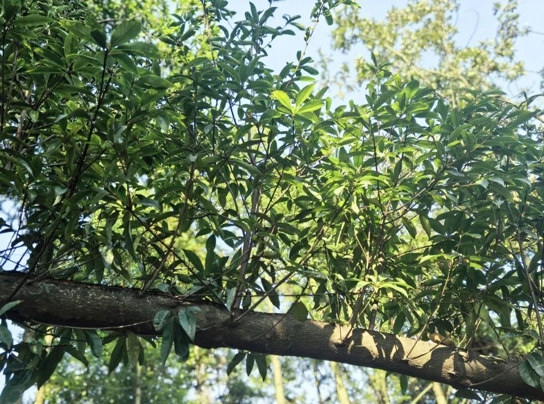 阳光穿过绿叶,在林中投下斑驳光影。步道旁,几株楠木虽因狂风倾倒,粗壮的枝干却托起侧枝的蓬勃生机——它们向着阳光伸展,展现出生命的韧性与智慧。