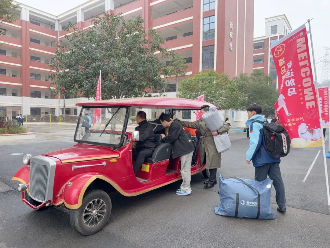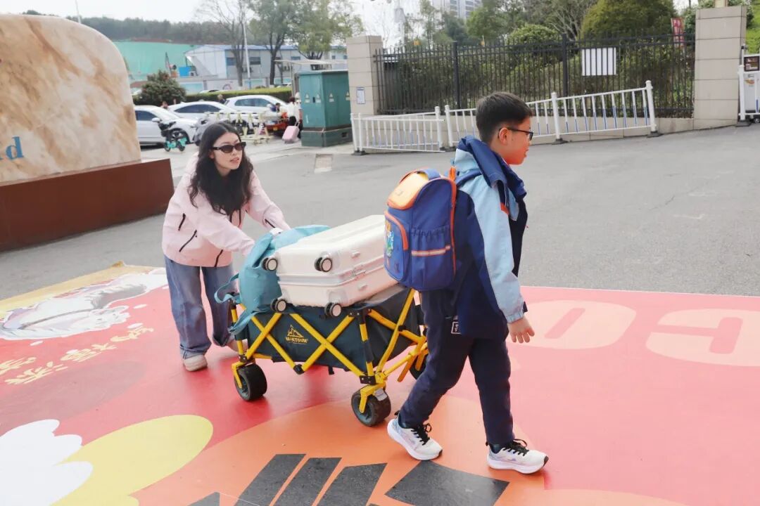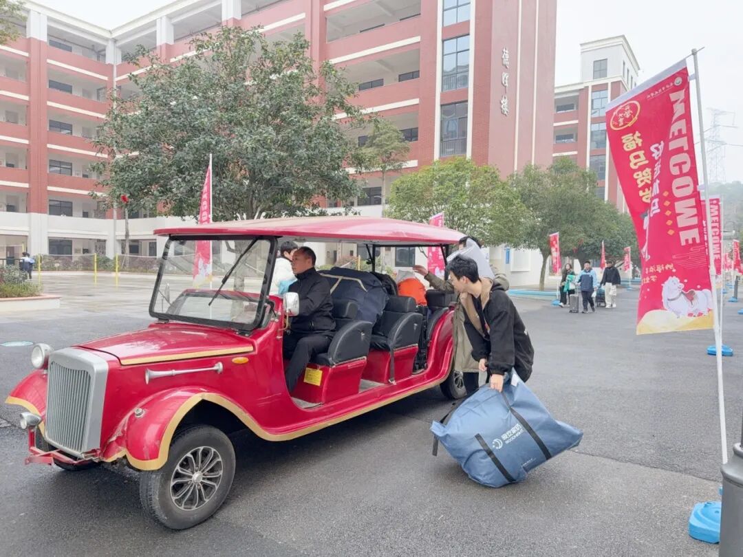 这辆小车载的不只是沉甸甸的行李,更是一份让家长和孩子们欣喜的新学期见面礼——我们希望,这小小的一趟摆渡车,不仅能运载同学们的行囊,更能传递校园里满满的爱与温度。
