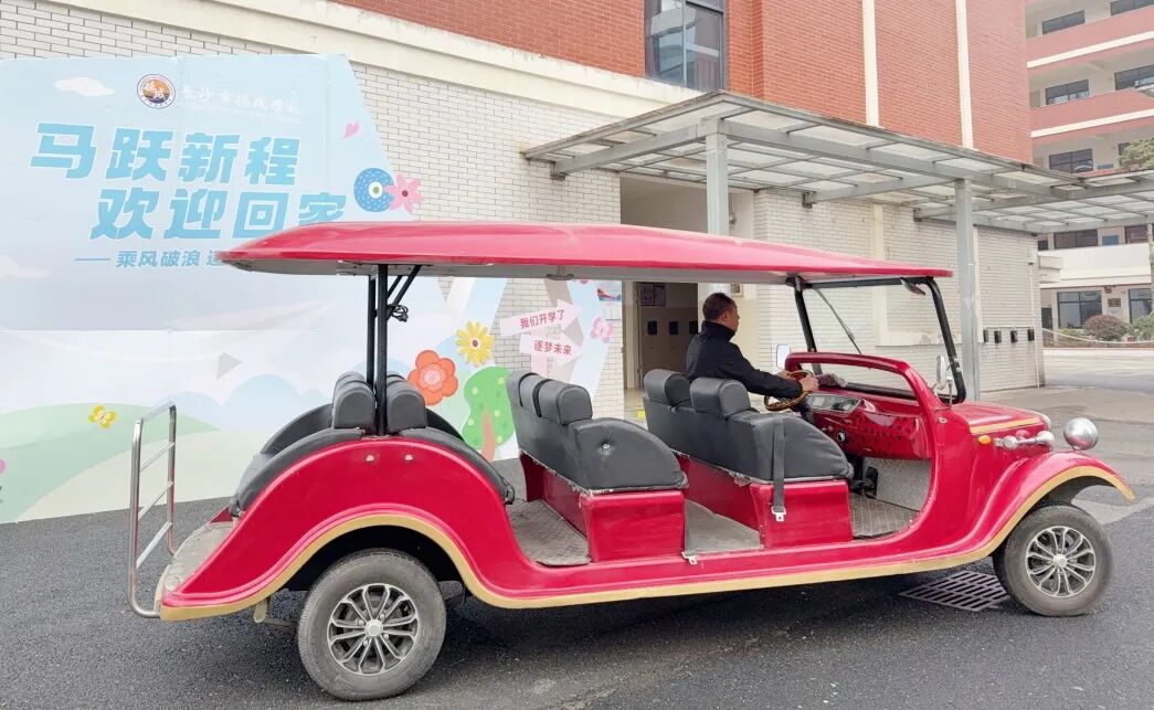 新学期的德成校园里穿梭着一辆洋气的红色接驳车。