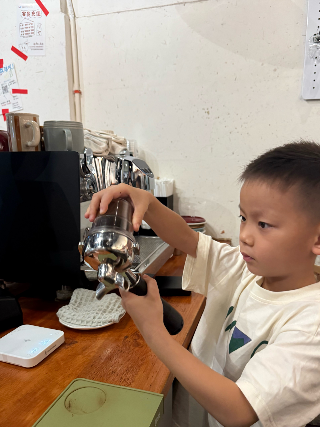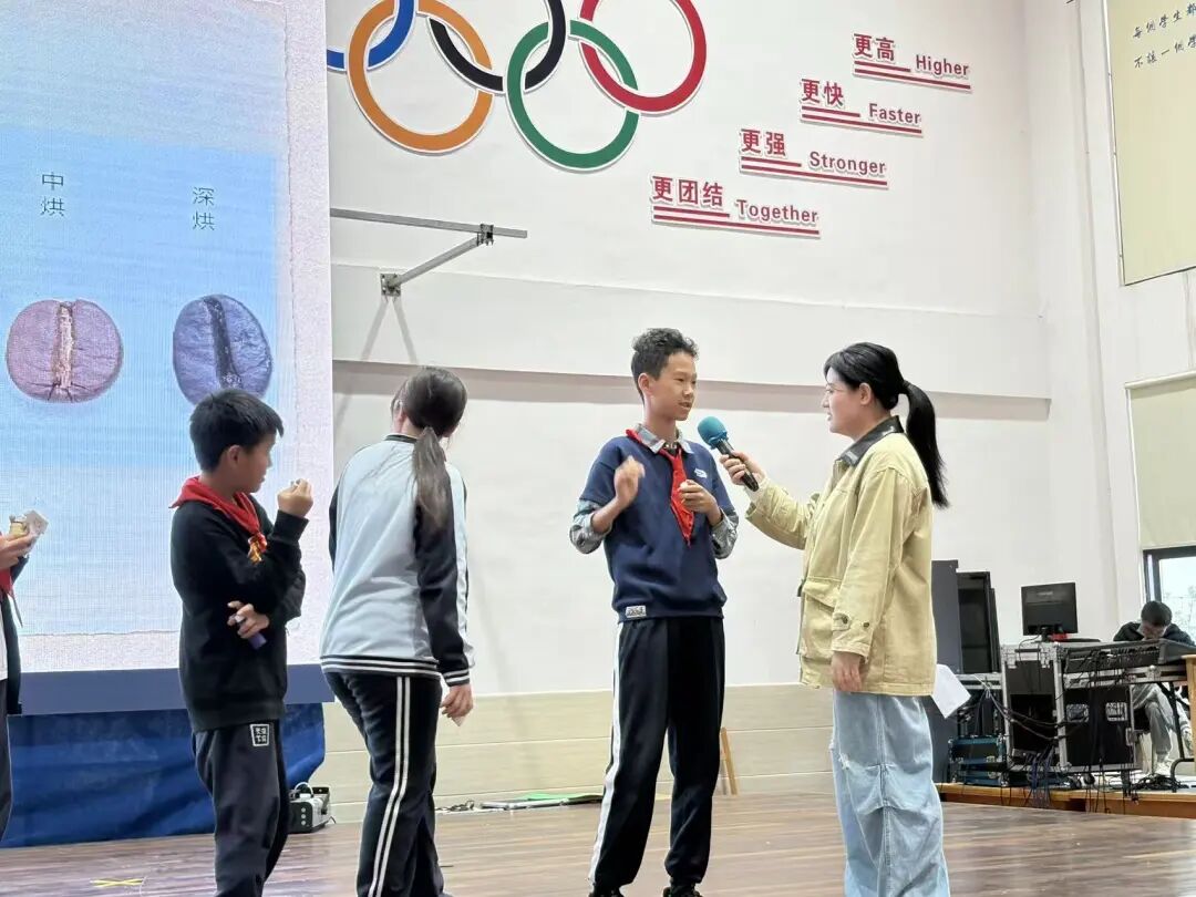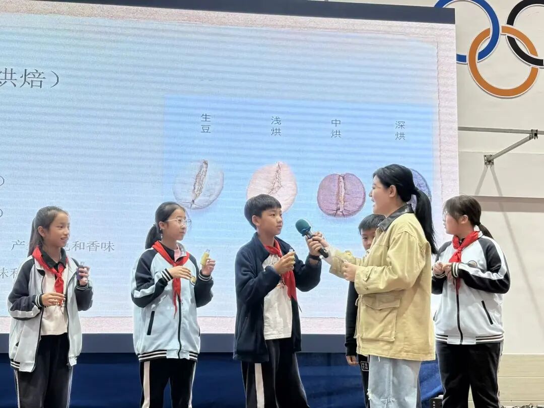 在孩子们对咖啡师职业建立起浓厚兴趣后,朱女士又顺势开启了 “咖啡小课堂”,带大家深入探索咖啡的奥秘。从咖啡豆的来源到采摘烘焙,从不同咖啡豆的研磨到各类咖啡的制作,每一步都充满了学问。